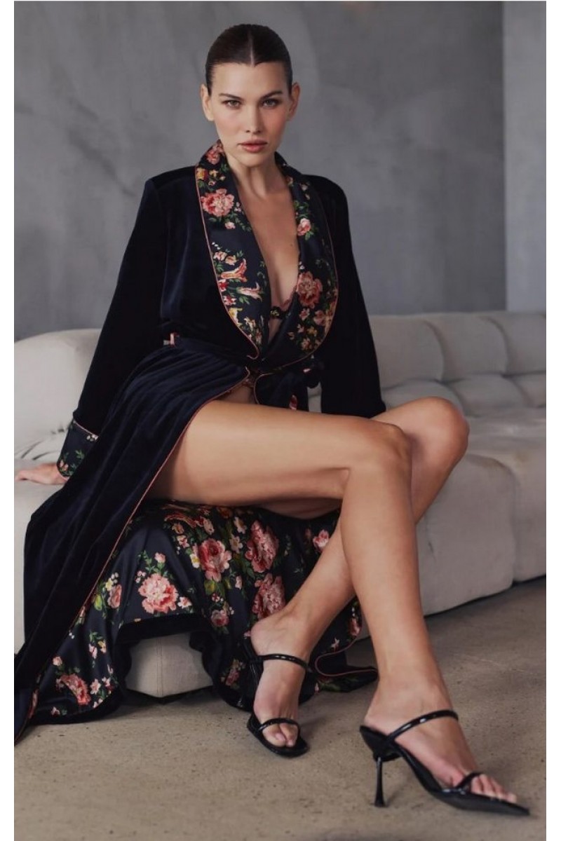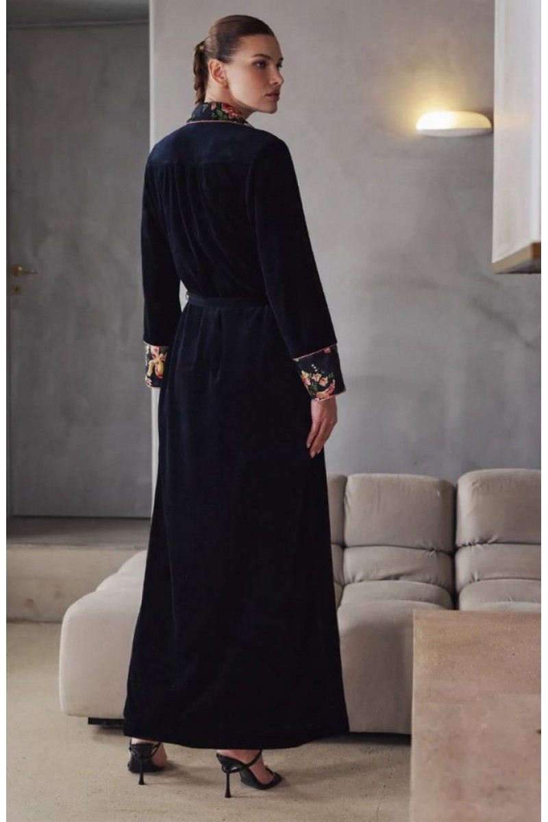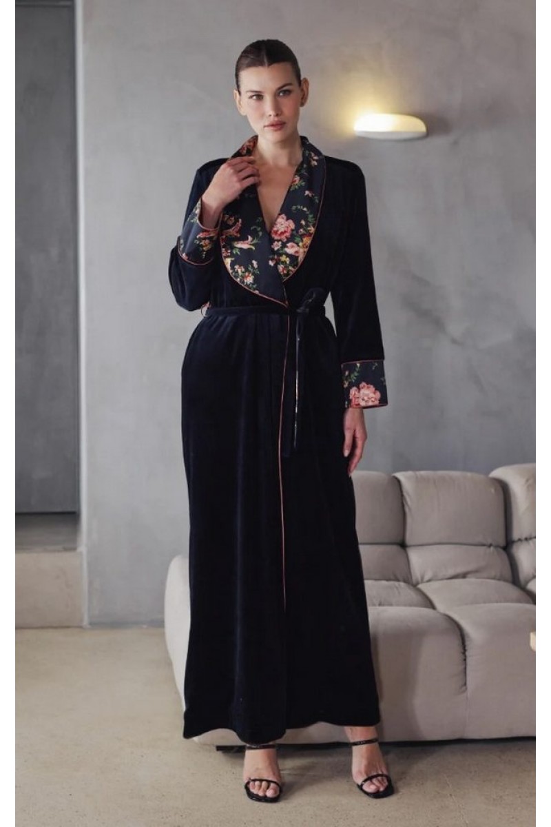 Длинный халат Халат Marjolaine BERNADETTE 4BER2201 0181 из черного бархата. Подкладка из атласа с цветочным принтом. Контрастные манжеты рукавов и воротник-шалька.
