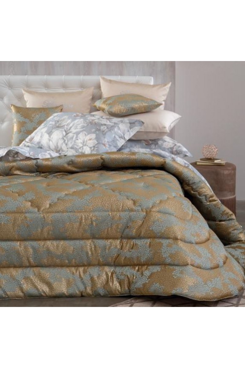 Элитное покрывало Blumarine KIMBERLY 270х270 голубое-золотистое 64 выполнено в строгом итальянском и классическом стиле из плотной хлопковой ткани, специальной обработки от статики. Оно средней плотности и внутри наполнено полиэстером.